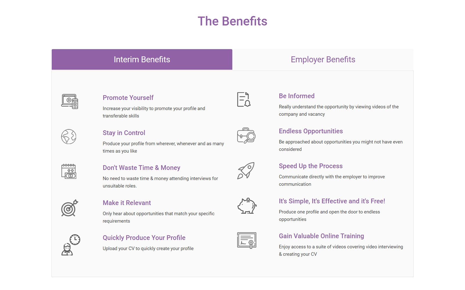 Simply upload your CV, outline the types of roles and locations you are seeking and answer 3 video interview questions to promote your experience and the types of roles you are seeking